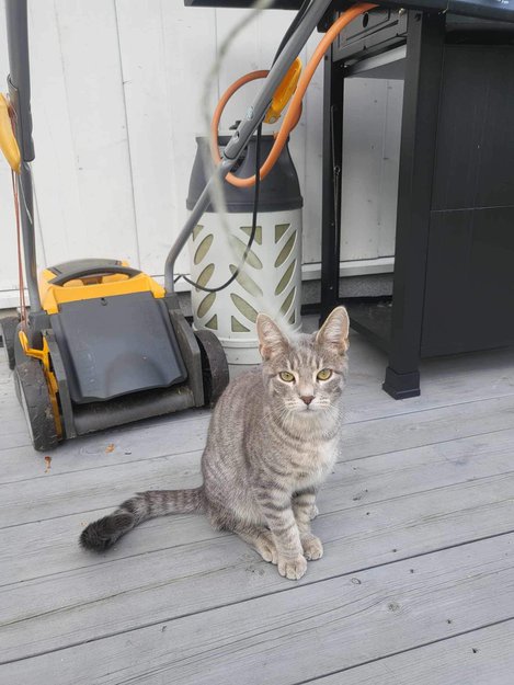 Katt funnet tidlig søndag 1. oktober, er utenfor huset i 3. strøm terrasse 12. Søker oppmerksomhet og vil ikke gå noe annet sted. Er ganske liten. Ikke noe halsbånd.