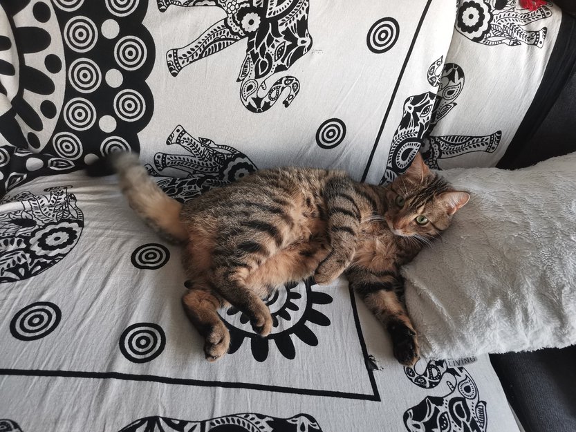 Hun er en utekatt, men kommer vanligvis hjem for å sove og spise. Noen ganger drar hun på lange turer (vanligvis 1 til 2 uker). Dette er første gang hun har vært savnet så lenge.