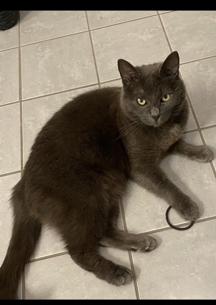 Hun er helt grå med noen hvite hår på brystet. Og hun har en klo på høyre bak ben som står litt ut etter at hun brakk den.