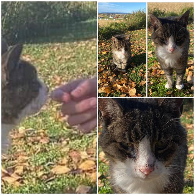 Katten dukket opp i en hage, i Møllerhagenvegen på Kolbu. Den virket syk og slapp. Verkende øyne og sår rundt nese og munn.