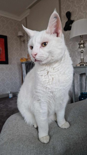 Helt hvit katt med "tatovering" i øret. Slank, men hengende mage/hud.