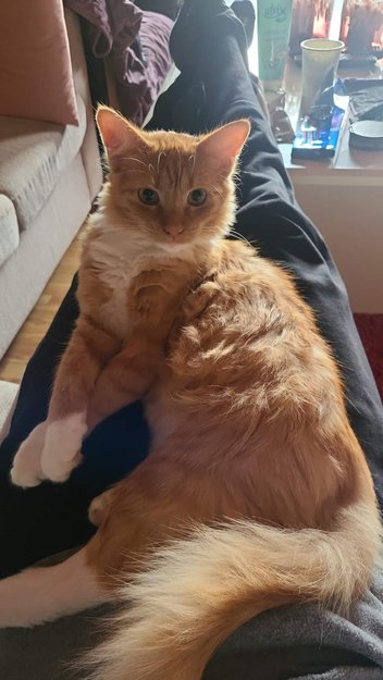 Han har en oransje flekk på hver bakben som er hvite. Tunga kommer som oftest ut når han får kos. Klassisk M mønster i panna som er litt mørkere oransje enn resten. Han er en veldig ung katt som ikke burde være ute alene.