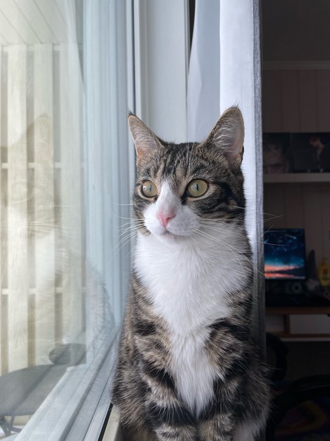 Theo er en tabby-katt som har id-tatovering i ene øret, rosa nese, svart underleppe.