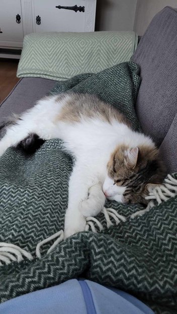 Sosial og nysgjerrig ung hunnkatt. Hvit rundt snute, på mage og poter. Buskete hale.