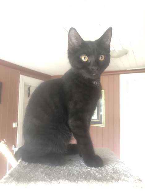 Svart skipskatt med svarte striper, se bildet. Litt hvitt, noen få hårstrå bare, på brystet. Hun er 6 måneder og veier ca 2 kg. Hun har 5 tær på alle potene.