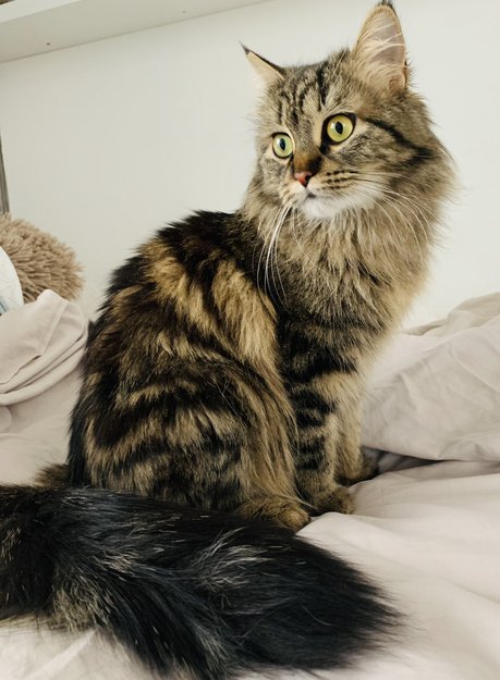 Hun har fått halsbånd på og kanskje halsbånd med tractive gps, den kan være mistet. Hun er ganske liten, tynn, litt over 3 kg. Nydelig lang myk pels, gulgrønne store øyne. Varmbrun og sorte striper, mørkere langhåret tykk hale. Litt sky mot fremmede.
