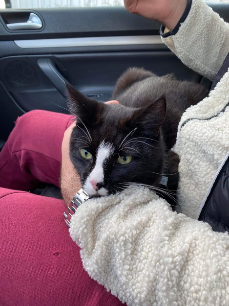 Fant katten på motorveien Rv 110 i Fredrikstad rett ved Ørebekk mot Oslo med seler på!