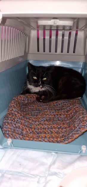 Oppdaget pus da hun gikk frem og tilbake over veien, på søk etter mat. Pjusk i pelsen, møkkete og var desperat på mat