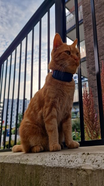 Oransje hannkatt med hvit haletupp, veldig imøtekommende, nysgjerrig og kosen. Blått halsbånd med blå Tractive GPS. Kan ha mistet halsbåndet.