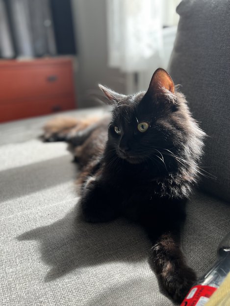 Langhåret ensfarget sort hannkatt. Norsk skogskatt. Kastrert men ikke id-chipped