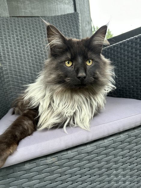 Egentlig langhåret katt, men fått løveklipp, mangler klipp oppe på ryggraden, ser ut som han har hanekam.