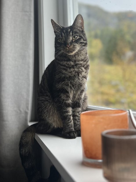 Mjauer og kommer for å kose. Har ID-merke i øret. Og har muligens et GPS-halsbånd på seg (tomt for strøm).