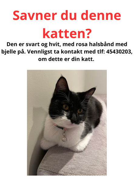 Den er svart og hvit med rosa halsbånd med bjelle på. Snuta er svart, alle bena er hvite, to av dem har en liten svart flekk.