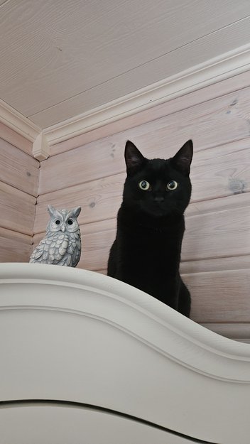 Svart katt, men bittelitt hvite hår foran på brystet. Han har flere klør og tær enb en vanlig katt - kan se ut som tomler. (Skipskatt)