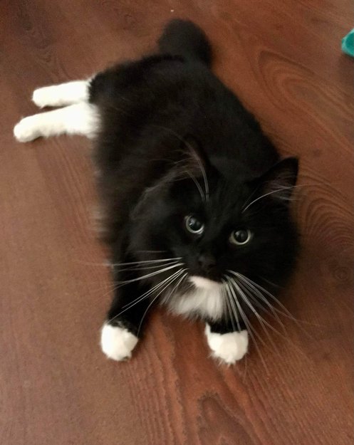 Svart. Hvit under munnen. Flink til å gjemme seg. Hvite poter framme, hvite ben bak. Mange lange, hvite værhår.
