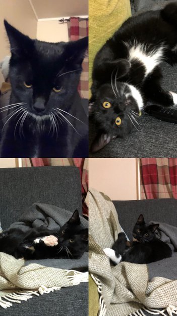 Liten og slank med svart glatt pels. Har hvit, tynn stripe på hake. Hvit flekk på bryst og mage. Svarte forlabber med noen hvite «tær», bakbeina er hvite fra «knærne» og ned. Venstre bakben har svart flekk på det hvite. Gule øyne.