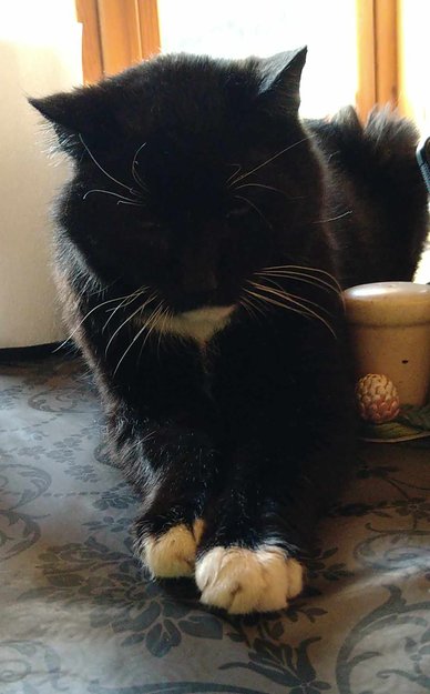 Svart katt med hvite poter og hvit under haken. Siden han er 18år så går han litt stivt.
