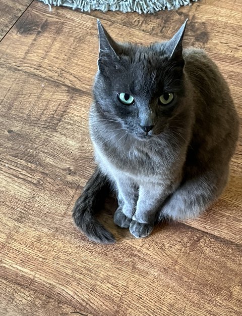 Pus har en hvit flekk på magen, Ellers er Hun grå. Hun er voksen, men Hun er liten. Grønne øyne. Hun er litt sky, men kan være veldig kosete.