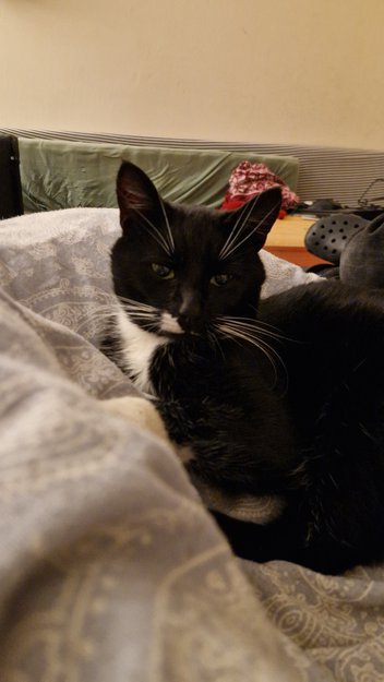 Hvit på brystet, halvt bart, sokker på fremfoten og ene beinet bak er hvitt og det andre beinet har "sokk".