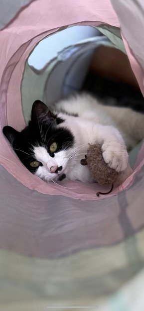 Svart og hvit pus, alle potene er hvite. Svart markering rett under nesen og på haken.