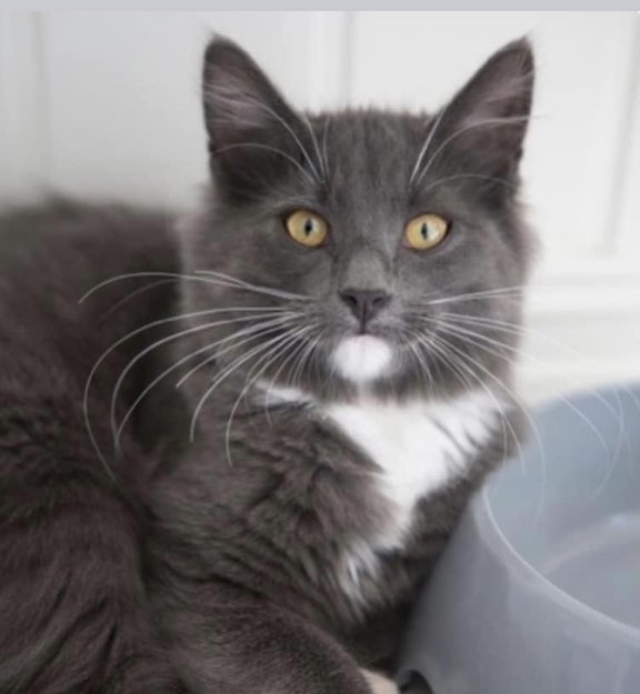Grå og hvit, flott hale. Liker å kose, maler. Litt skeptisk til fremmede!