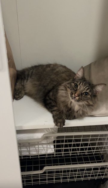 Fire år gammel pus, litt liten for alderen. Hun heter Lucie, og har grå og svarte striper. Lucie er langhåret og har en liten brun flekk på hodet som kjennetegn. Ansiktet er søtt og feminint. Hun er tillitsfull og koselig, men samtidig smart. God reaksjon, og alle sanser i god behold.