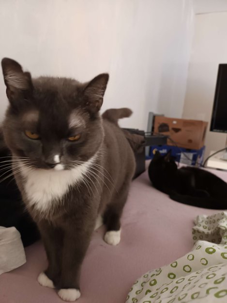 Grå pels med hvitt bryst, hvit stripe på nesa og hvit hake. 4 hvite poter, men større mønster på bakbena. Mørkegule øyne, med brun flekk på venstre øye. Hakk i høyre øre.