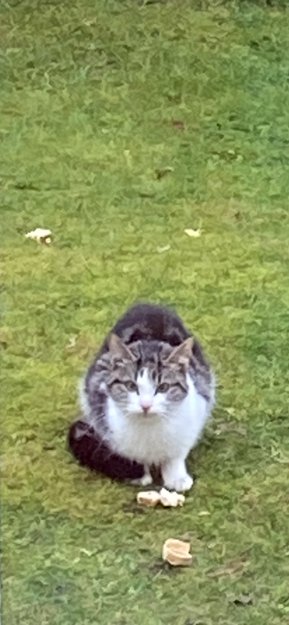 Engstelig, sulten liten katt oppholder seg i området. Spiser av fuglemat, brød etc.