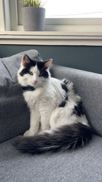 En tillitsfull og nyskjerrig katt og ca 8 mnd gammel. Han er mest hvit, med noen sorte flekker og en sort hale. Han har også en liten sort flekk rett ved den ene poten. Nokså langt hår og ganske stor for alderen.