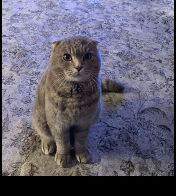 Han har mørke grå pels og har brettet ører (scottish fold rase)
