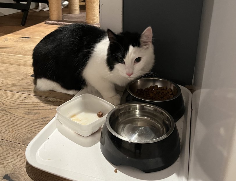 Katten gikk rundt i Vardesvingen i Fyllingsdalen og mjauet utenfor boligene her, og prøvde å komme inn. Vi var på vei ut døren, og da føk katten inn. Katten løp ut på kjøkkenet og spiste opp all maten til katten vår. Den virket veldig sulten! Virker kosete.