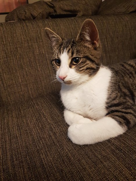 Hannkatt, ser ukastrert ut. Kan se ut som han er en plass imellom 8-12 mnd, men kan være eldre. Har et veldig distinkt kjennetegn på munnen. En brun flekk over og under munn.