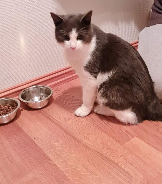 Etter at den har dukket opp vandret rundt i Sarpsborg så valgte vi i samarbeid med de som oppdaget han, å ta den inn. Den er grå og hvit. Den lukter litt låve/uthus, har vært i slosskamp og har flere flått på seg. Er kjempe tørst og kjempe sulten. Og kjempe hengiven og kosete...❤️