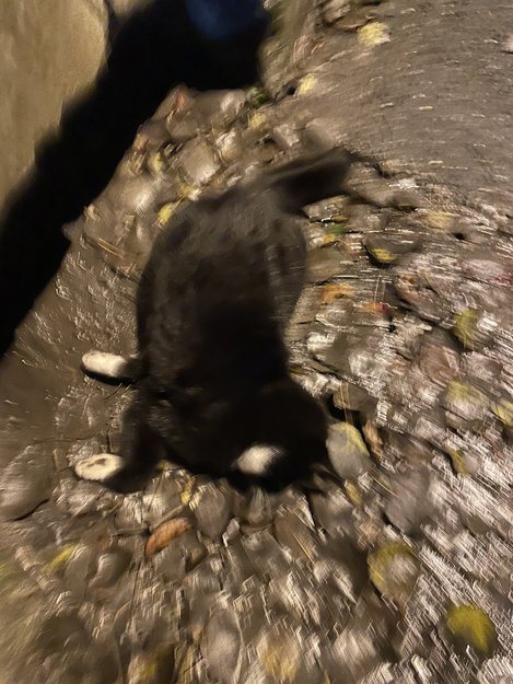 Tok ett bilde men ble ikke så bra.. men den er svart med hvite poter foran og bak. Hvit under halsen.