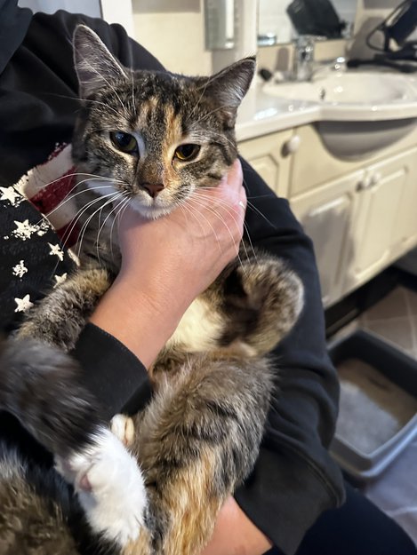 Pusen er en hu-katt, ikke chippet eller sterilisert. Ca. 1 år trodde veterinær.