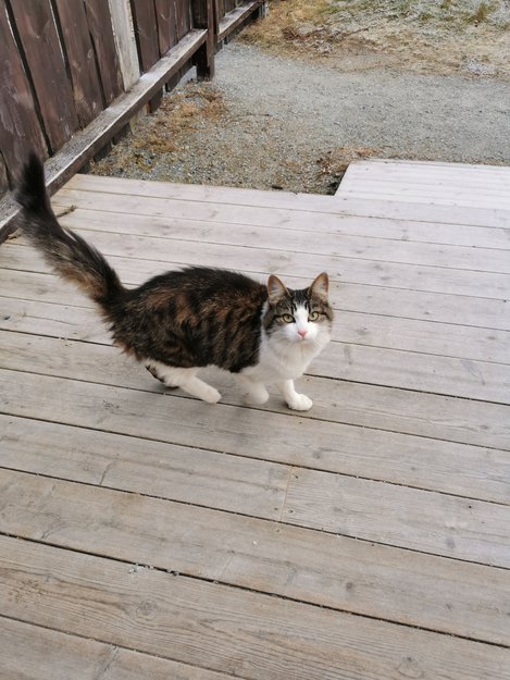 Sosial og snill katt, vant med barn. Har hatt en eier, men har sikkert kommet bort. Vært utenfor hegle barnehage i en uke nå. Virker kald og sulten. Ingen chip.