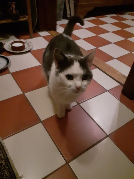 Katten virker å være vant til å bo i hus og fant seg veldig fort til rette etter at vi tok den inn. Den liker godt å bli klappet og ser ut til å være en snill katt. På magen er den hvit, men den er hvit og mørkegrå på resten av kroppen. Halen er grå.
