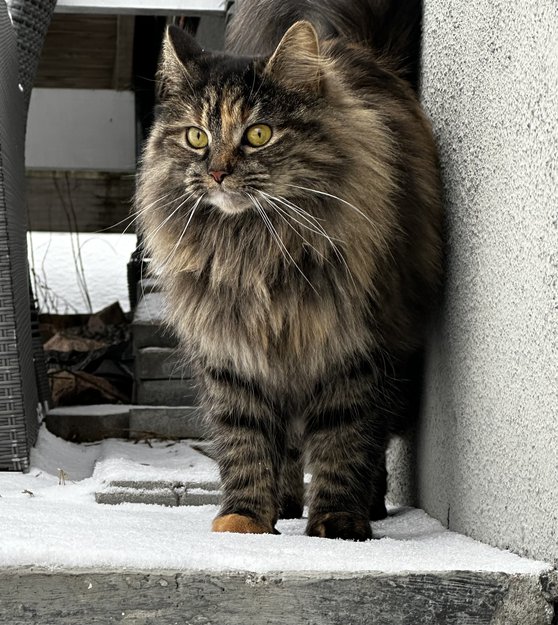 Molly er lett gjenkjennelig da høyre frampote er beige/lys. Hun har en fluffy hale og er langhåret.