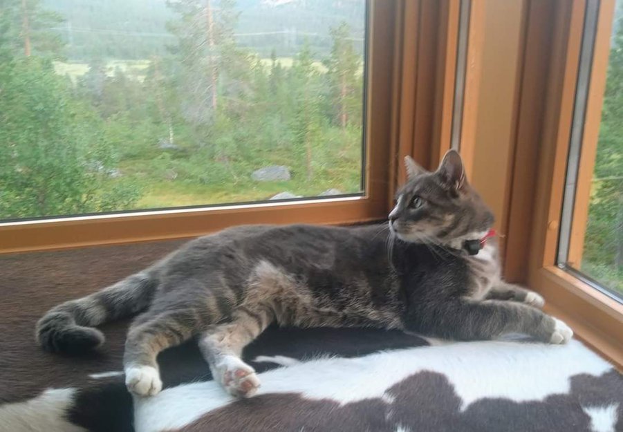 Grå med hvite sokker, bryst og flekk på nesen. Stripene tydeligere på bena. Gråfargen går mot litt mer gyllent på beina og undersiden.