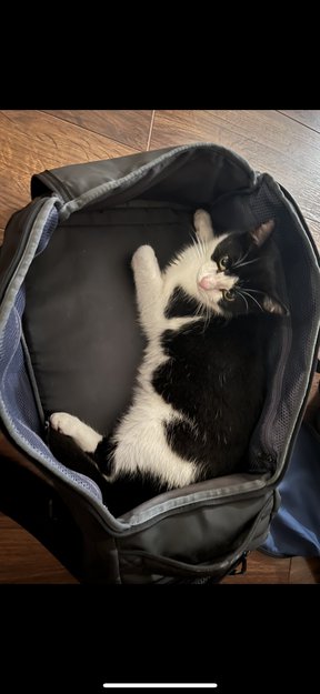 Svart pelstegning på venstre skulder. En litt skjev hjørnetann nede som stikker litt ut