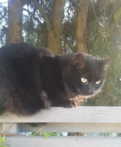 Han er stort sett svart, men med noen hvite hår her og der. Gule øyne. Mjauer en del. Han kommer bort når man lokker og var veldig snill selv når vi måtte stappe ham i en reiseveske.
