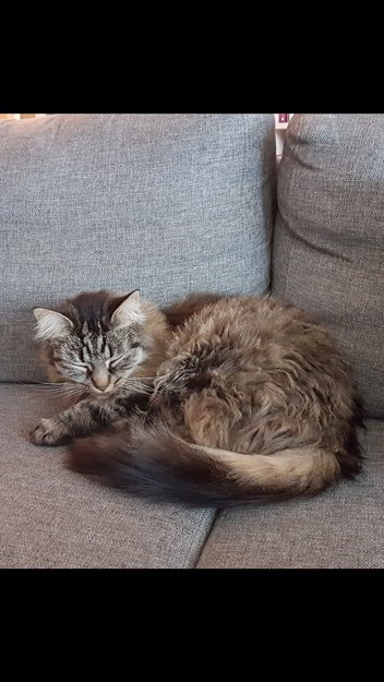 Skogkatt ca 4 år, ikke så stor, veldig kjælen. Lysere brun under magen.