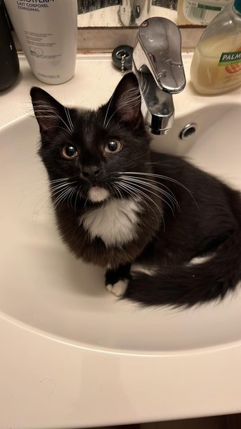 Helsvart med hvitt skjegg/bryst og mage. Hvite poter.