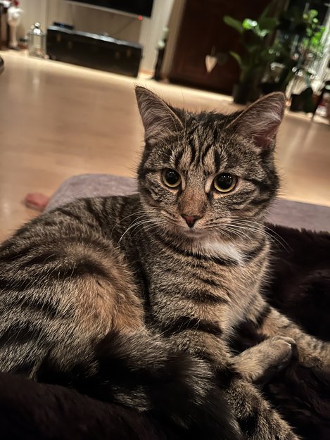 Tigerstripet i brun/grå/svart med hvit flekk på brystet
