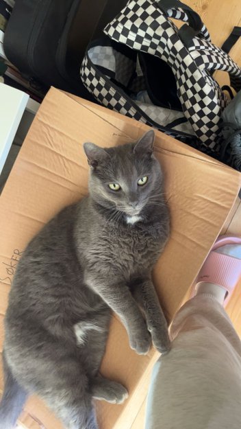 Hun er askegrå med hvit merking fram på brystet, under mellom framfotene, nederst på magen og hun har noen hvitt ytterst på noen tær på bakfotene.