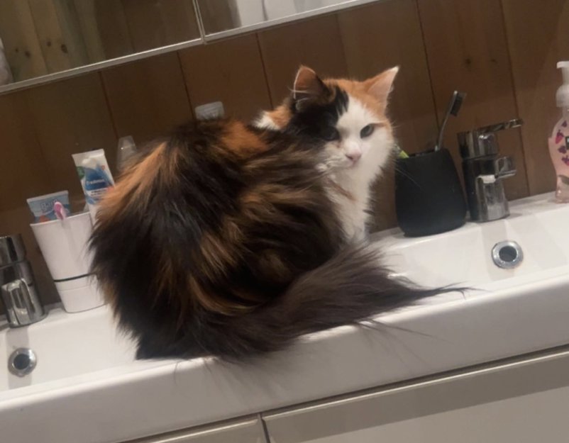 Langhåret tricolour katt. Nysgjerrig pus, men kan være redd ukjente. Mørk flekk under øyet pga tett tårekanal.