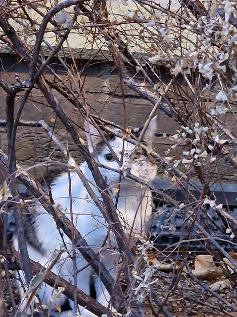 Virker som den har gått seg bort. Gjemmer seg i buskene. Rapporterer fordi det er kaldt og fordi jeg mener jeg så en lapp hengende på et supermarked hvor de leter etter en lignende katt (supermarked Coop Prix Kampen?(usikker)).