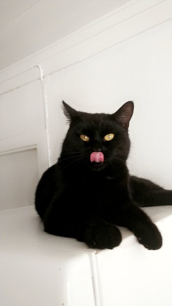 Hu er sort men skinner mørk mørk brun i sola. Hu har 4-5 hvite hårstrå på brystet.
