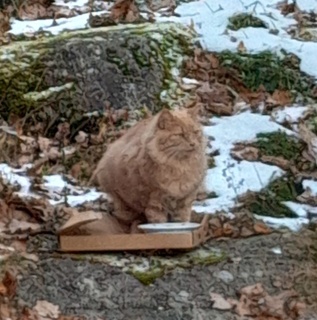 Sterk mjauing fra skogen flere ganger. Har kommet og forsvunnet. Mulig den har spist mat som ble satt ut. Spist i dag ganske nærme huset og jeg fikk for første gang tatt bilder. Har vært her 3-4 ganger. Veldig sky, men kommuniserer mye med mjauing. Gikk inn i skogen etter den hadde spist.