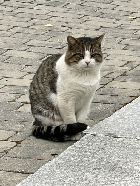 Hannkatten som stadig kommer til oss, og er veldig sulten. Tidligere i sommer var den tydelig skadet, men virker å være ok nå. Vi har etterlyst den på lokalt på Facebook, og flere hevder å kjenne den og at den er hjemløs. Har visstnok vært innom flere andre, og tidvis bodd i en låve.